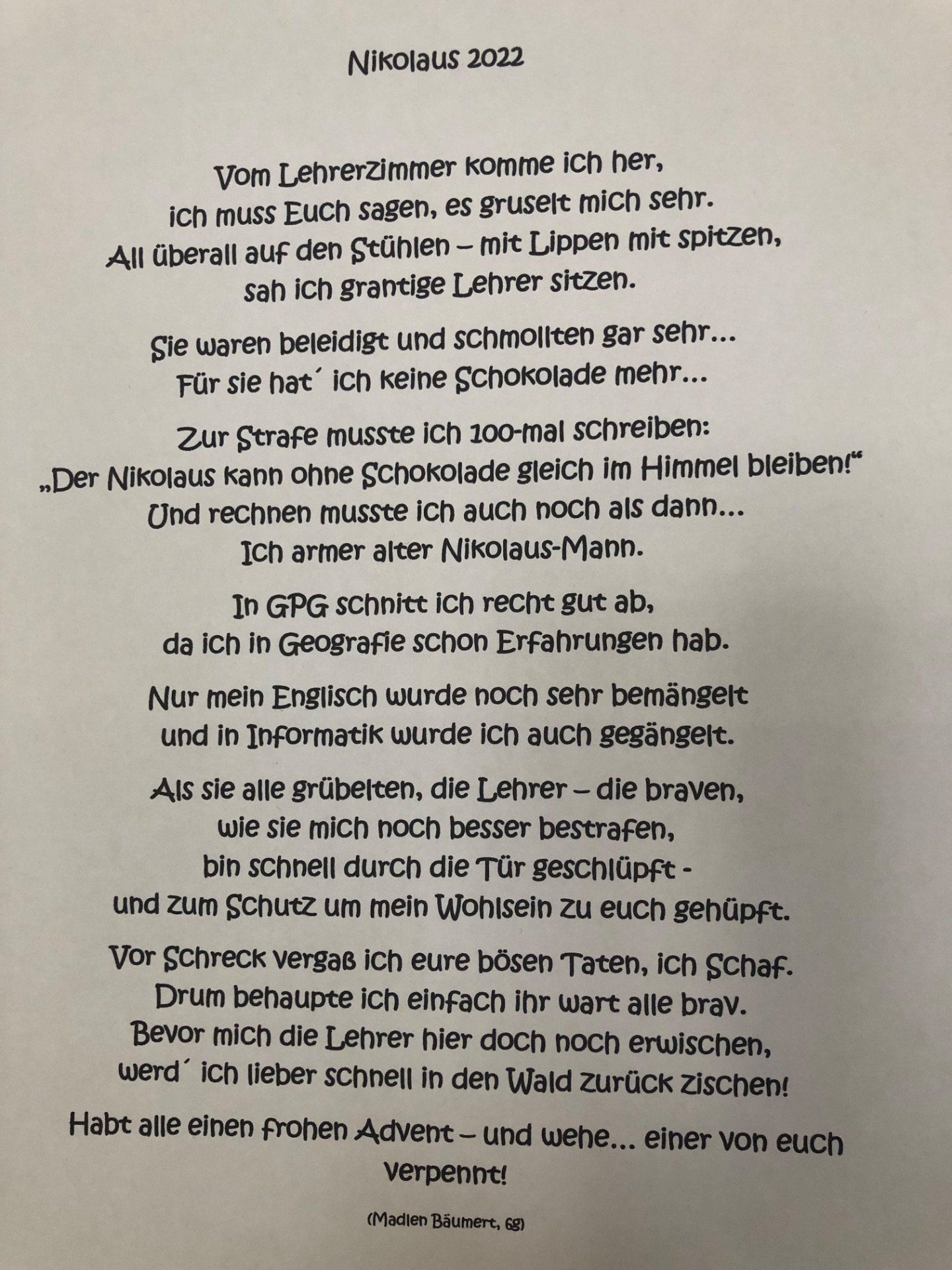 Der Nikolaus war da und brachte uns ein tolles Gedicht und ganz viele Leckereien!!! - Klasse 6g
